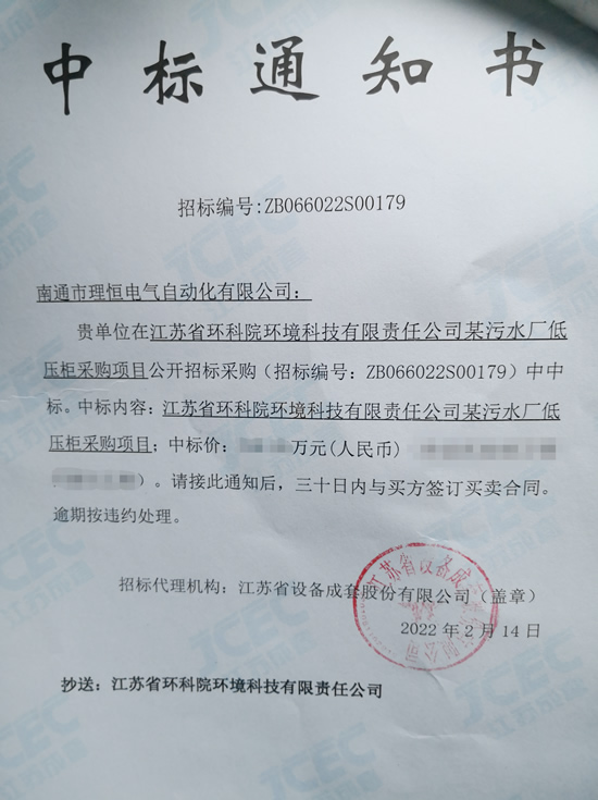 新年伊始,我司在江蘇省環科院環境有限責任公司公開招標的某污水廠低壓柜采購項目中中標,從而取得虎年生產經營的開門紅。