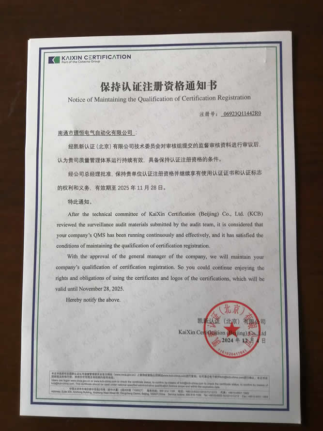 日前,我司收到國家質量管理認證中心發來的通知書,經專家驗收,我司繼續保持認證注冊資格,并繼續享有使用認證證書和認證標志的權利和義務。